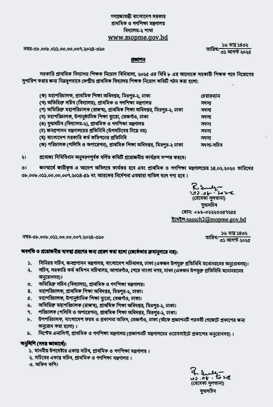 গত ৩১ আগস্ট, ২০২৫ তারিখে মন্ত্রণালয়ের বিদ্যালয়-২ শাখা থেকে জারি করা এক প্রজ্ঞাপনে এই তথ্য জানানো হয়েছে। এই কমিটি সরকারি শিক্ষক পদে নিয়োগের জন্য সুপারিশ করবে। নবগঠিত এই কমিটির প্রধান (চেয়ারম্যান) হিসেবে দায়িত্ব পেয়েছেন প্রাথমিক শিক্ষা অধিদপ্তরের মহাপরিচালক। কমিটির অন্য সদস্যরা হলেন: