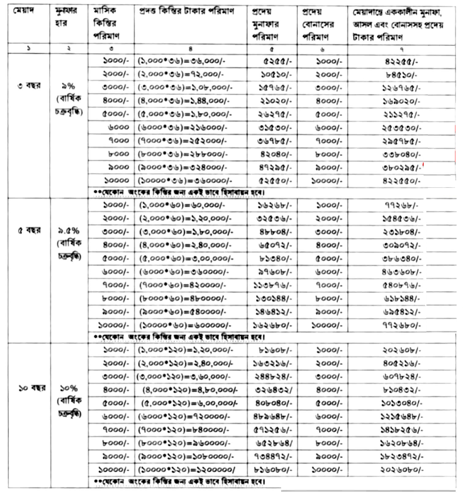 | মাসিক কিস্তি (টাকা) | ৩ বছর শেষে (৯%) | ৫ বছর শেষে (৯.৫%) | ১০ বছর শেষে (১০%) |