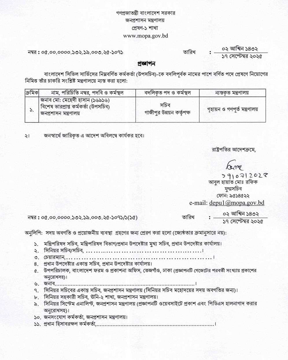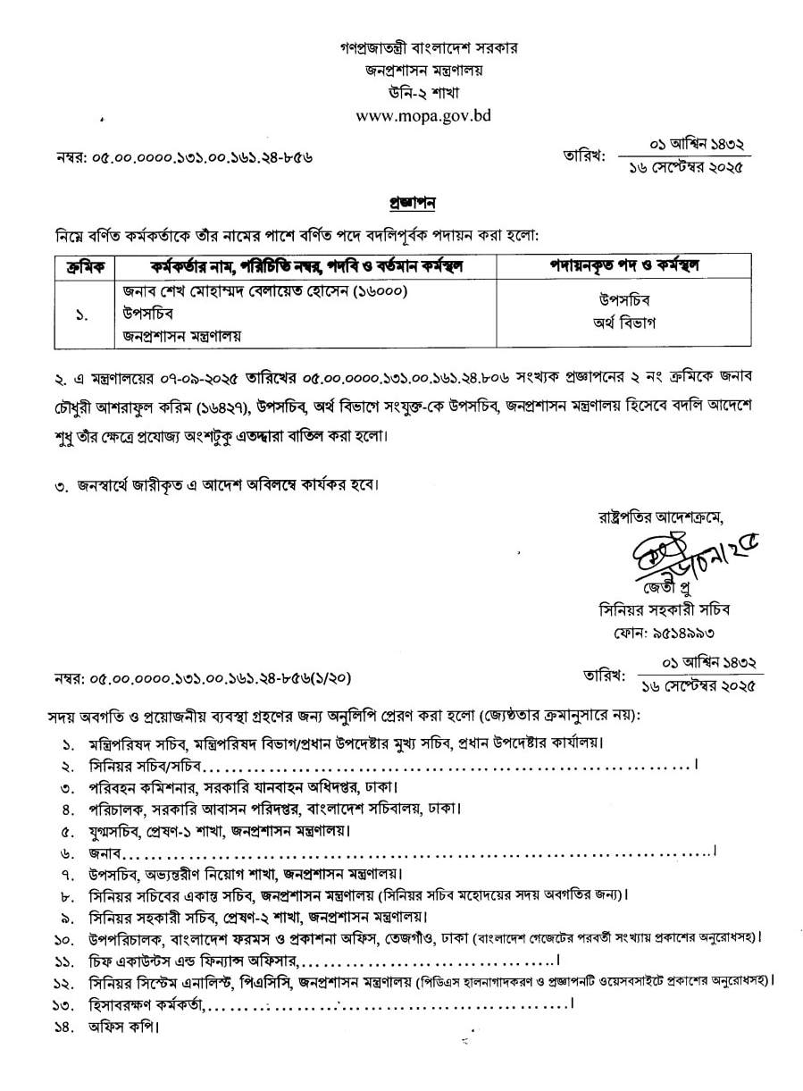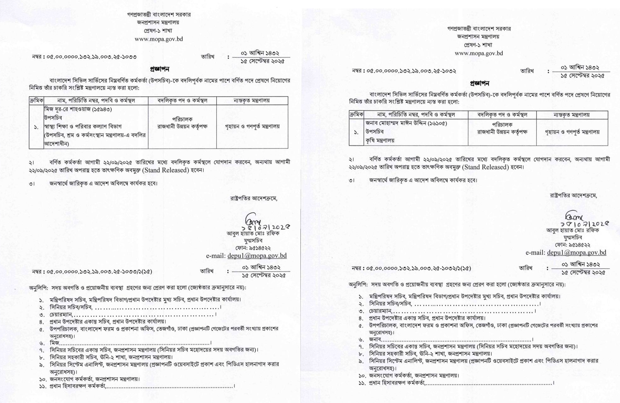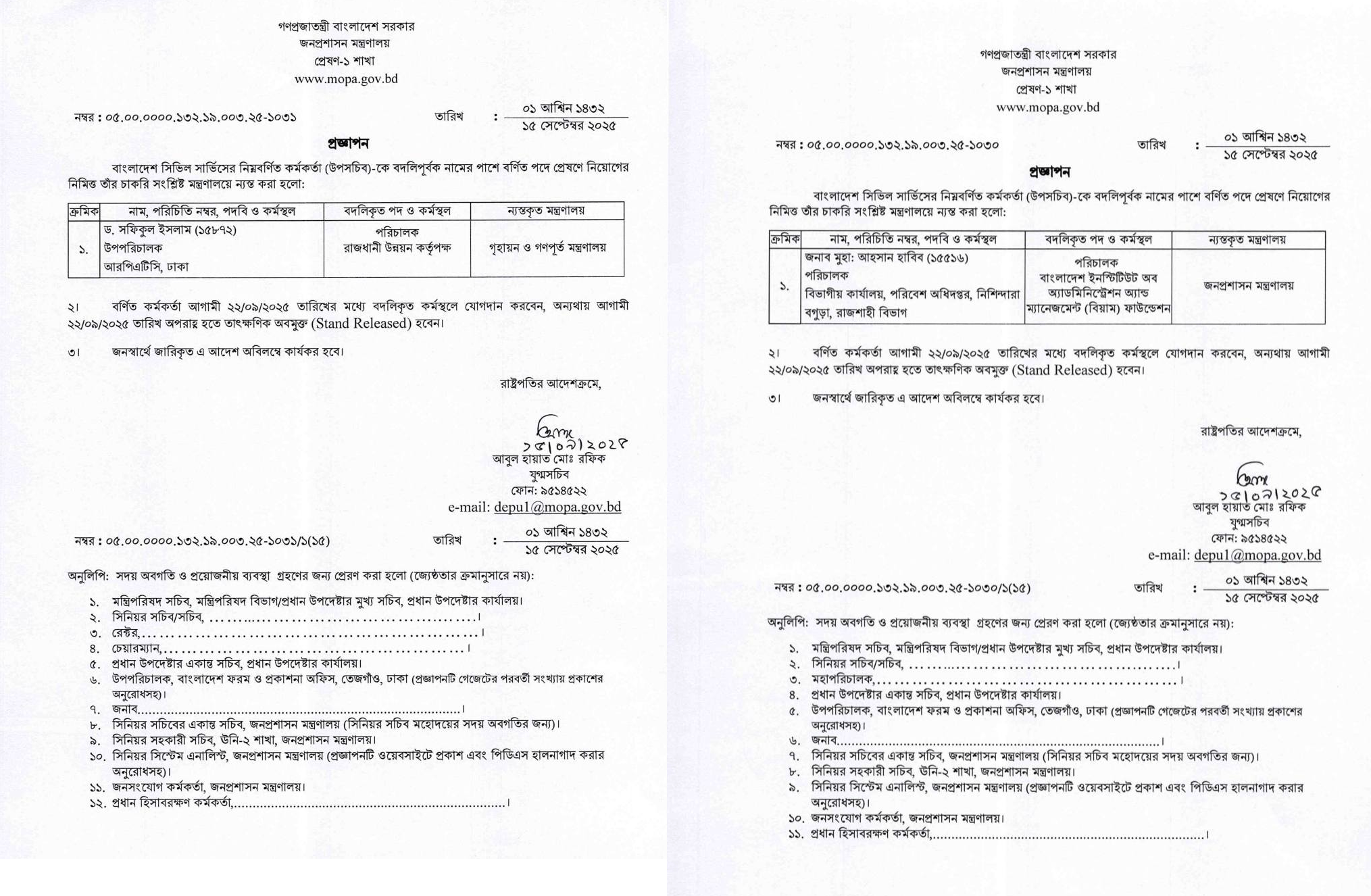 উপসচিব পদে পদায়ন/বদলি প্রজ্ঞাপন ২০২৫। বিভিন্ন দপ্তরে ডিএস পদে পরিবর্তন আনা হয়েছে?