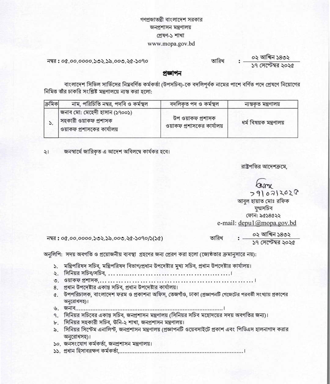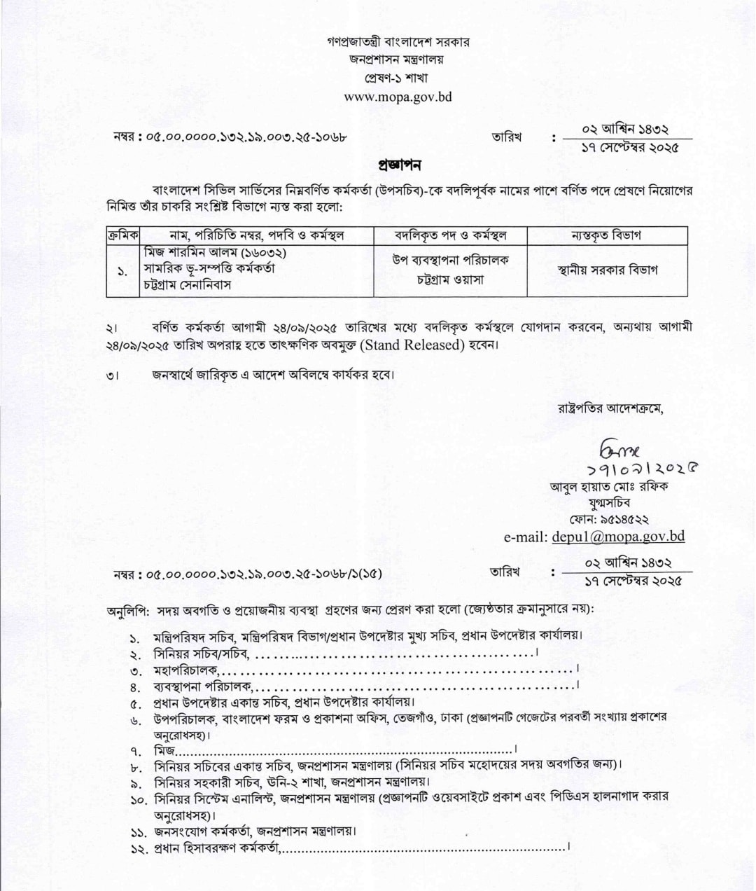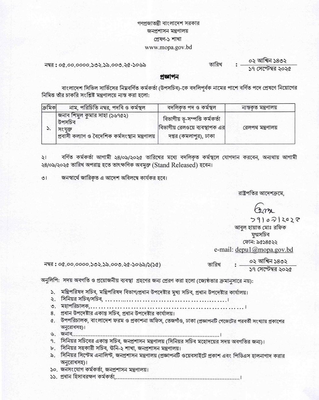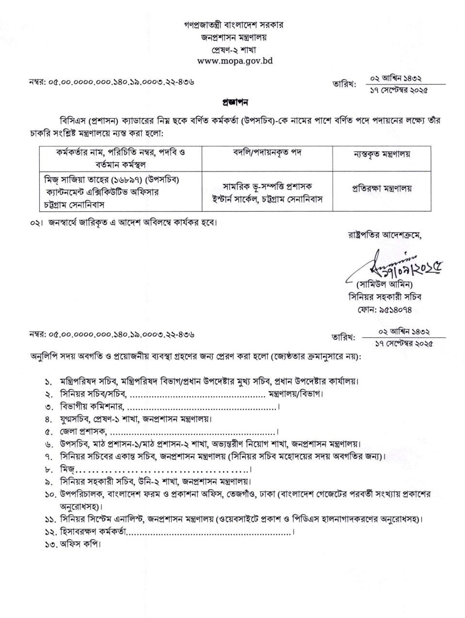 উপসচিব পদে পদায়ন/বদলি প্রজ্ঞাপন ২০২৫। বিভিন্ন দপ্তরে ডিএস পদে পরিবর্তন আনা হয়েছে?