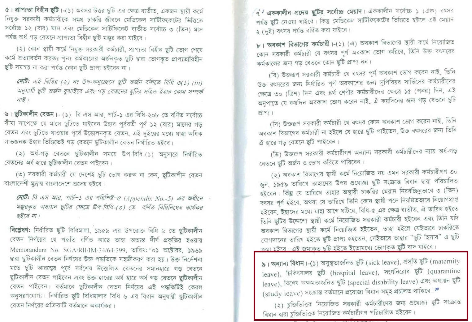 নােট: প্রয়ােগ নাই। বিশ্লেষণ: (১) গুটি বসন্ত, কলেরা, টাইফাস জ্বর, প্লেগ ও সেরিব্রোস্পাইনাল মেনেনজষ্টাটিস রােগের ক্ষেত্রে এই প্রকার ছুটি প্রদান করা যাইবে। (স্বাস্থ্য ও পরিবার মিল্পনা মন্ত্রণালয়ের জনস্বাস্থ্য শাখার স্মারক নং জনস্বাস্থ্য/১কিউ৪/৩৪২, তারিখ: ২৩ এপ্রিল, ১৯৭৫।)