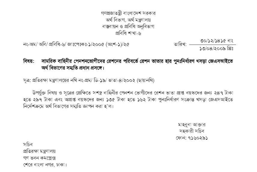 সামরিক বাহিনীর পেনশনভোগীদের রেশনের পরিবর্তে রেশন ভাতা বিস্তারিত জানতে আদেশ দেখুন: ডাউনলোড