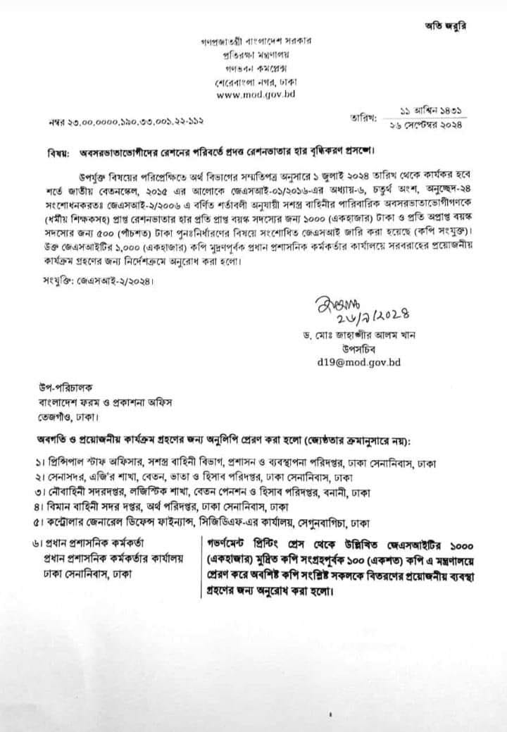 অর্থ বিভাগের সম্মতিপত্র অনুসারে ১ জুলাই ২০২৪ তারিখ থেকে কার্যকর হবে শর্তে জাতীয় বেতনস্কেল, ২০১৫ এর আলোকে জেএসআই-০১/২০১৬-এর অধ্যায়-৬, চতুর্থ অংশ, অনুচ্ছেদ- ২৪ সংশোধনকরতঃ জেএসআই-২/২০০৬ এ বর্ণিত শর্তাবলী অনুযায়ী সশস্ত্র বাহিনীর পারিবারিক অবসরভাতাভোগীগণকে (ধর্মীয় শিক্ষকসহ) প্রাপ্ত রেশনভাতার হার প্রতি প্রাপ্ত বয়স্ক সদস্যের জন্য ১০০০ (একহাজার) টাকা ও প্রতি অপ্রাপ্ত বয়স্ক সদস্যের জন্য ৫০০ (পাঁচশত) টাকা পুনঃনির্ধারণের বিষয়ে সংশোধিত জেএসআই জারি করা হয়েছে।