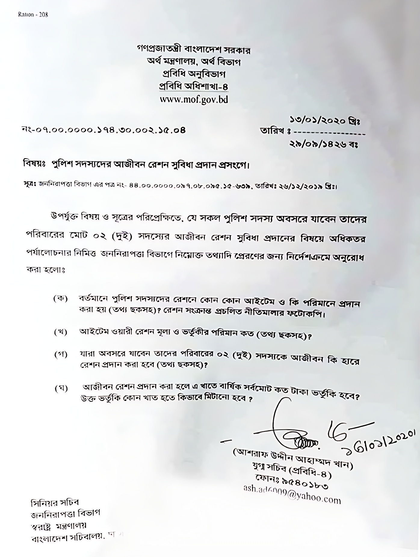 উপর্যুক্ত বিষয় ও সূত্রের পরিপ্রেক্ষিতে, যে সকল পুলিশ সদস্য অবসরে যাবেন তাদের পরিবারের মোট ০২ (দুই) সদস্যের আজীবন রেশন প্রদানের বিষয়ে অধিকতর পর্যালোচনার নিমিত্ত জননিরাপত্তা বিভাগে নিম্নোক্ত তথ্যাদি প্রেরণের জন্য নির্দেশক্রমে অনুরোধ করা হলো।