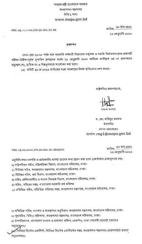 বেতন গ্রেড ১৩-২০ পর্যন্ত পদে সরকারি কর্মচারী নিয়োগের কর্তৃপক্ষ ও পদ্ধতি নির্ধারণসংক্রান্ত প্রস্তাবটি পরীক্ষা-নিরীক্ষাপূর্বক সুপারিশ প্রণয়নের লক্ষ্যে ১৬ ফেব্রুয়ারি ২০১০ তারিখে জারীকৃত ৩৪ নং প্রজ্ঞাপনের অনুচ্ছেদ (খ), ক্রমিক নং-৩ নিম্নরূপভাবে সংশোধন করা হয়েছে। কমিটি ৩১ মে-২০২৩ তারিখের মধ্যে সরকারের নিকট প্রতিবেদন পেশ করবে।