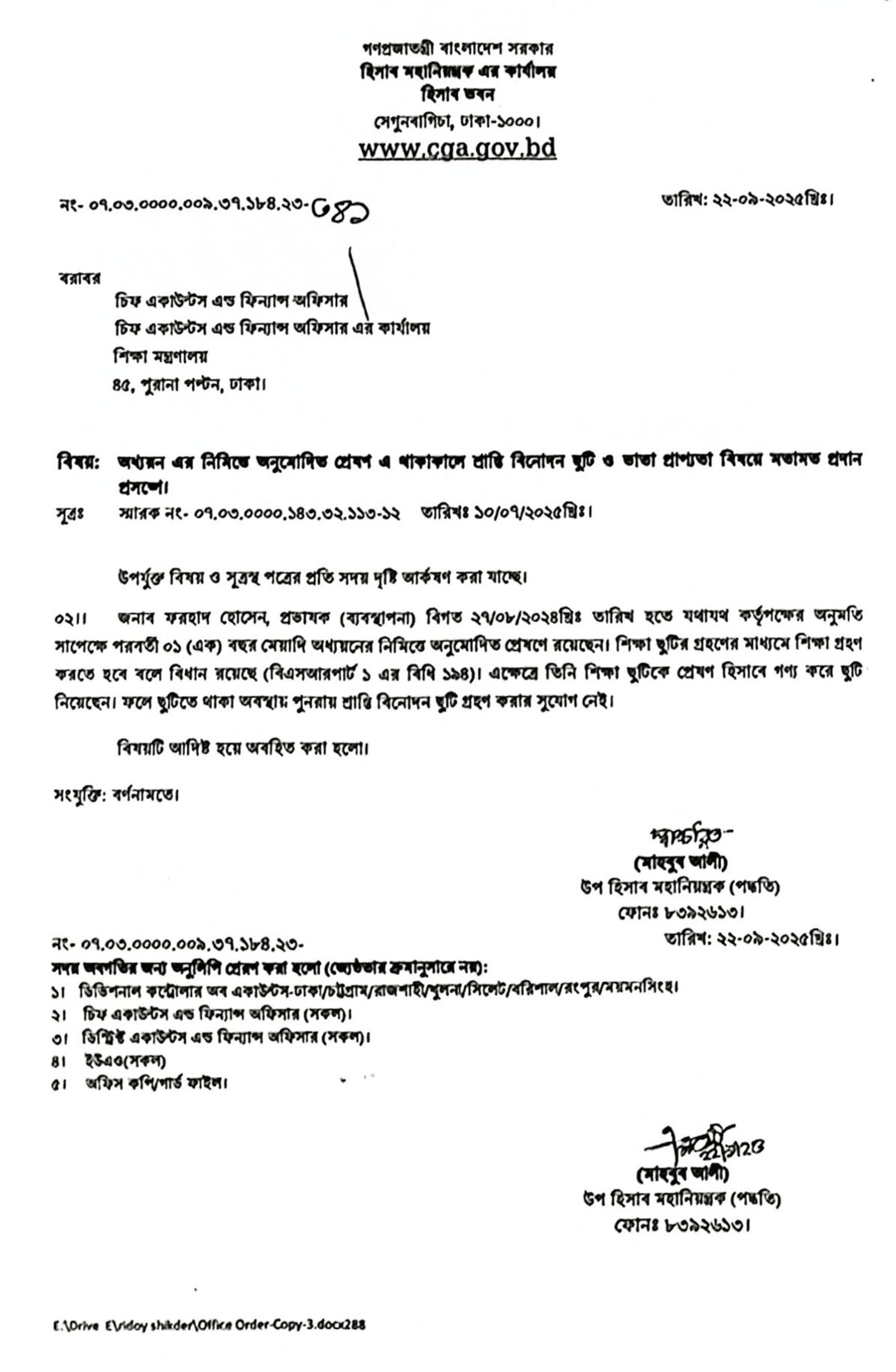 অধ্যয়ন ছুটিতে থাকলে কি শ্রান্তি বিনোদন পাওয়া যায়? না। জনাব ফরহাদ হোসেন, প্রভাষক (ব্যবস্থাপনা) বিগত 27/08/20২৪ খ্রিঃ তারিখ হতে যথাযথ কর্তৃপক্ষের অনুমতি সাপেক্ষে পরবর্তী ০১ (এক) বছর মেয়াদি অধ্যয়নের নিমিত্তে অনুমোদিত প্রেষণে রয়েছেন। শিক্ষা ছুটির গ্রহণের মাধ্যমে শিক্ষা গ্ৰহণ করতে হবে বলে বিধান রয়েছে (বিএসআরপার্ট ১ এর বিধি ১৯৪)। এক্ষেত্রে তিনি শিক্ষা ছুটিকে প্রেষণ হিসাবে গণ্য করে ছুটি নিয়েছেন। ফলে ছুটিতে থাকা অবস্থায় পুনরায় শ্রান্তি বিনোদন ছুটি গ্রহণ করার সুযোগ নেই।