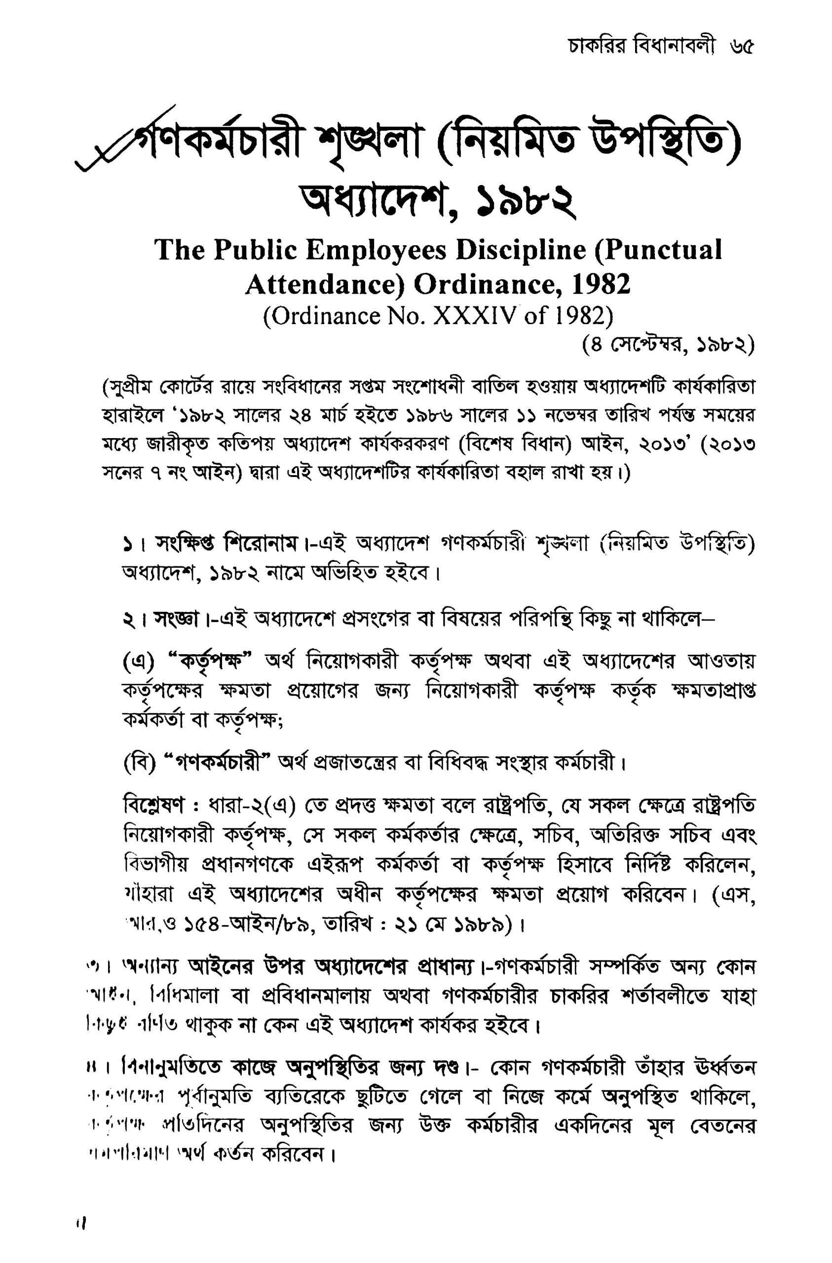 গণকর্মচারী শৃঙ্খলা (নিয়মিত উপস্থিতি) অধ্যাদেশ ১৯৮২- গণকর্মচারী শৃঙ্খলা (নিয়মিত উপস্থিতি) অধ্যাদেশ ১৯৮২ অন্য কোন আইন, বিধিমালা বা প্রবিধানমালায় অথবা গণকর্মচারী চাকরির শর্তাবলীতে যাহা কিছুই বর্ণিত থাকুক না কেন এই অধ্যাদেশ মোতাবেক অপরাধের পুনরাবৃত্তির জন্য দন্ড কার্যকর হইবে।