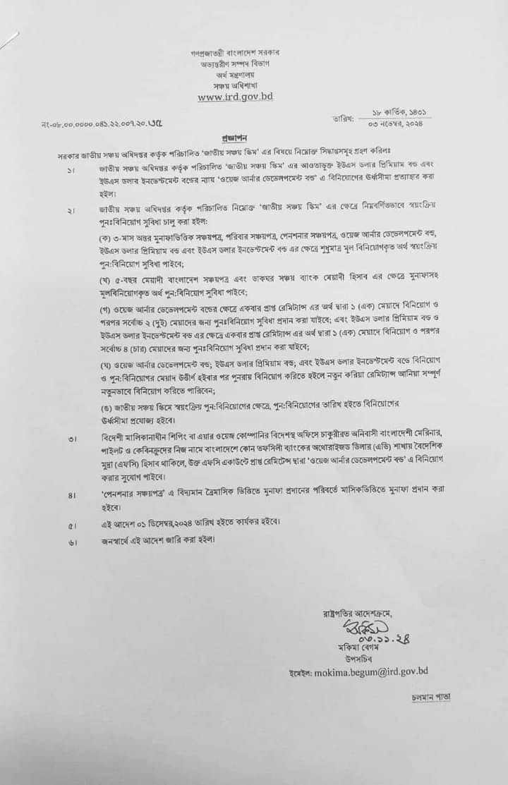 জাতীয় সঞ্চয় স্কিনে স্বয়ংক্রিয় পুন:বিনিয়োগের ক্ষেত্রে, পুন:বিনিয়োগের তারিখ হইতে বিনিয়োগের ঊর্ধ্বসীমা প্রযোজ্য হইবে। বিদেশী মালিকানাধীন শিপিং বা এয়ার ওয়েজ কোম্পানির বিদেশস্থ অফিসে চাকুরীরত অনিবাসী বাংলাদেশী মেরিনার, পাইলট ও কেবিনক্রুদের নিজ নামে বাংলাদেশে কোন তফসিলী ব্যাংকের অথোরাইজড ডিলার (এডি) শাখায় বৈদেশিক মুদ্রা (এফসি) হিসাব থাকিলে, উক্ত এফসি একাউন্টে প্রাপ্ত রেমিটেন্স দ্বারা ‘ওয়েজ আর্নার ডেভেলপমেন্ট বন্ড’ এ বিনিয়োগ করার সুযোগ পাইবে। ‘পেনশনার সঞ্চয়পত্র’ এ বিদ্যমান ত্রৈমাসিক ভিত্তিতে মুনাফা প্রদানের পরিবর্তে মাসিকভিত্তিতে মুনাফা প্রদান করা হইবে। এই আদেশ ০১ ডিসেম্বর, ২০২৪ তারিখ হইতে কার্যকর হইবে।