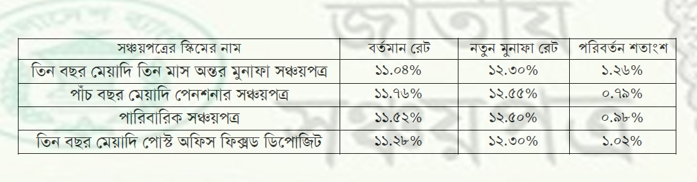 ব্যাংক আমানতের সুদের হার বৃদ্ধি পাওয়ার ফলে সঞ্চয়পেত্র সুদের বা মুনাফার হার সরকার বৃদ্ধি করার সিদ্ধান্ত নিয়েছে-এখনও প্রজ্ঞাপন জারি হয়নি তবে খুব শিঘ্রই জারি হবে– সঞ্চয়পত্র নতুন মুনাফা রেট ২০২৫