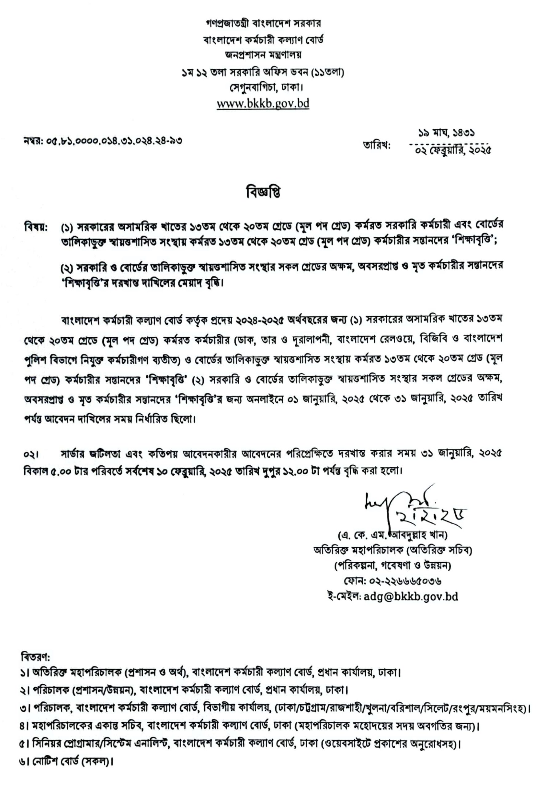 সরকারের অসামরিক খাতের ১৩তম থেকে ২০তম গ্রেডে (মূল পদ গ্রেড) কর্মরত সরকারি কর্মচারী এবং বোর্ডের তালিকাভুক্ত স্বায়ত্তশাসিত সংস্থায় কর্মরত ১৩তম থেকে ২০তম গ্রেড (মূল পদ গ্রেড) কর্মচারীর সন্তানদের ‘শিক্ষাবৃত্তি’-শিক্ষা বৃত্তি আবেদনের সময় বৃদ্ধি ২০২৪