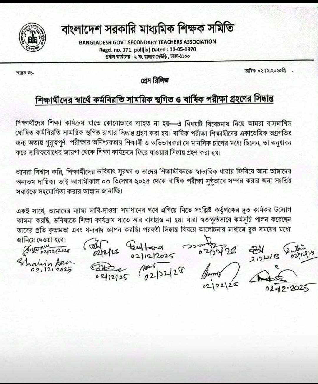 শিক্ষার্থীদের শিক্ষাজীবন ও বার্ষিক পরীক্ষার গুরুত্ব বিবেচনা করে অবশেষে কর্মবিরতি স্থগিতের ঘোষণা দিয়েছে বাংলাদেশ সরকারি মাধ্যমিক শিক্ষক সমিতি (বাসমাশিস)। এই সিদ্ধান্তের ফলে ঢাকাসহ সারাদেশে সরকারি মাধ্যমিক বিদ্যালয়গুলোতে চলমান অচলাবস্থা কেটে গিয়ে বুধবার (৩ ডিসেম্বর) থেকে নিয়মিত সূচি অনুযায়ী বার্ষিক পরীক্ষা অনুষ্ঠিত হবে।