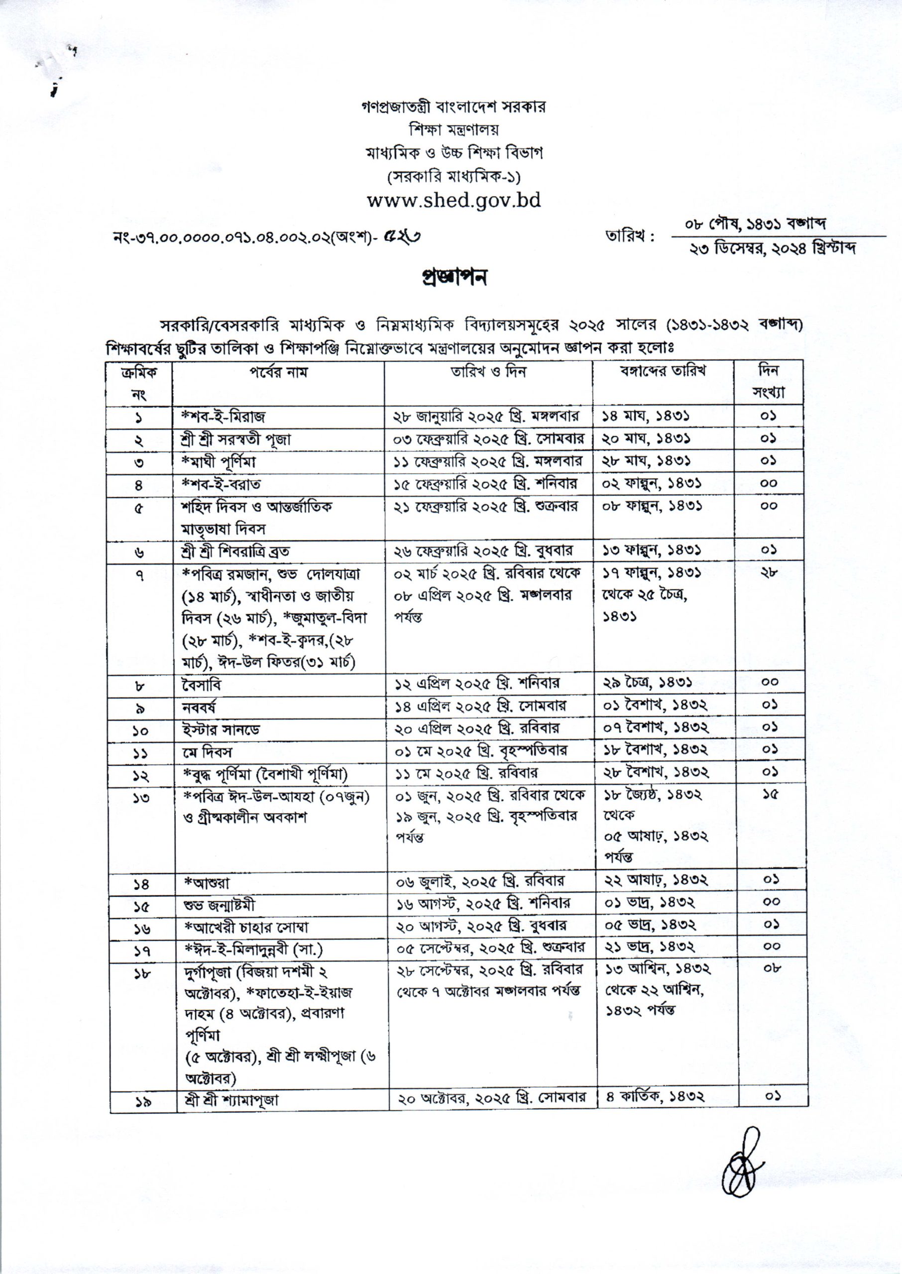 মাধ্যমিক বিদ্যালয়ের ছুটির তালিকা ২০২৫ । বাংলাদেশের হাইস্কুল সর্বমোট ৭৬ দিন বন্ধ থাকবে