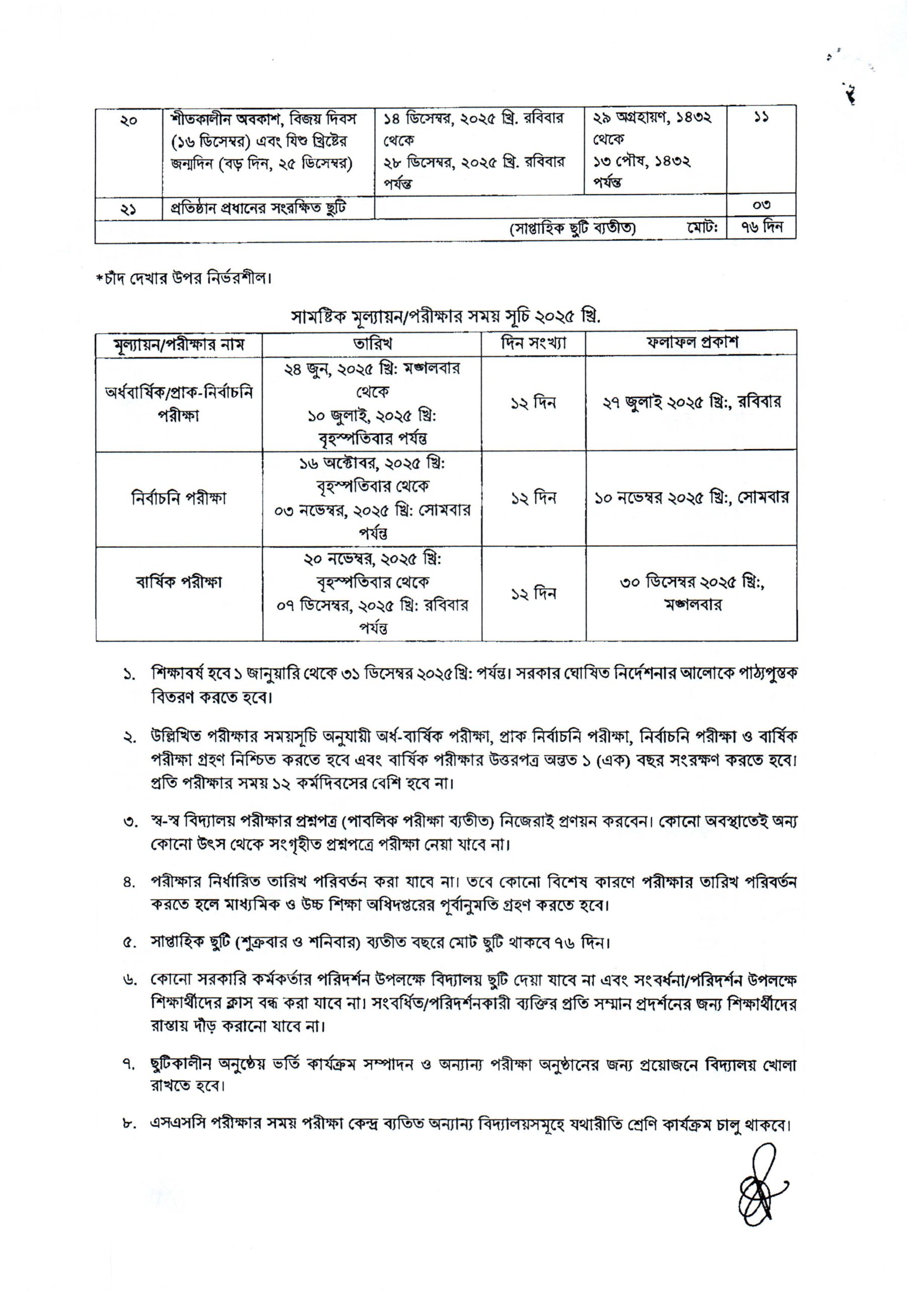 সাপ্তাহিক ছুটি (শুক্রবার ও শনিবার) ব্যতিত বছরে মোট ছুটি থাকবে ৭৬ দিন। কোনো সরকারি কর্মকর্তার পরিদর্শন উপলক্ষে বিদ্যালয় ছুটি দেয়া যাবে না এবং সংবর্ধনা/ পরিদর্শন উপলক্ষে শিক্ষার্থীদের ক্লাস বন্ধ করা যাবে না। সংবর্ষিত পরিদর্শনকারী ব্যক্তির প্রতি সম্মান প্রদর্শনের জন্য শিক্ষার্থীদের রাস্তায় দাঁড় করানো যাবে না। Government holidays Calendar । ছুটির ক্যালেন্ডার ২০২৩ । শিক্ষা প্রতিষ্ঠানের ছুটির তালিকা ২০২৫