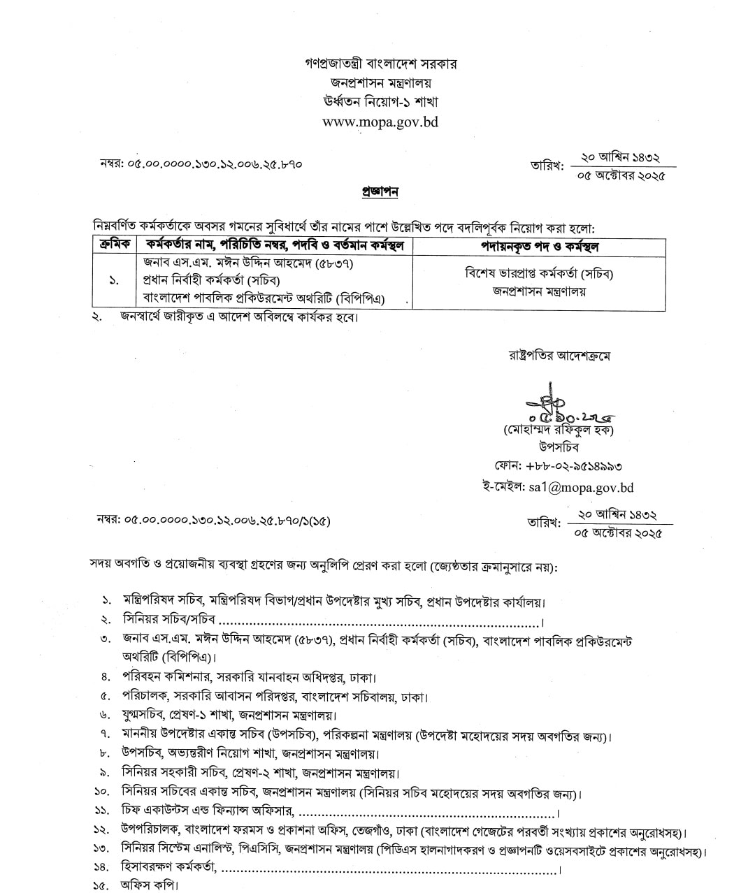 জনপ্রশাসন মন্ত্রণালয় – সচিবগণের তালিকা ২০২৫