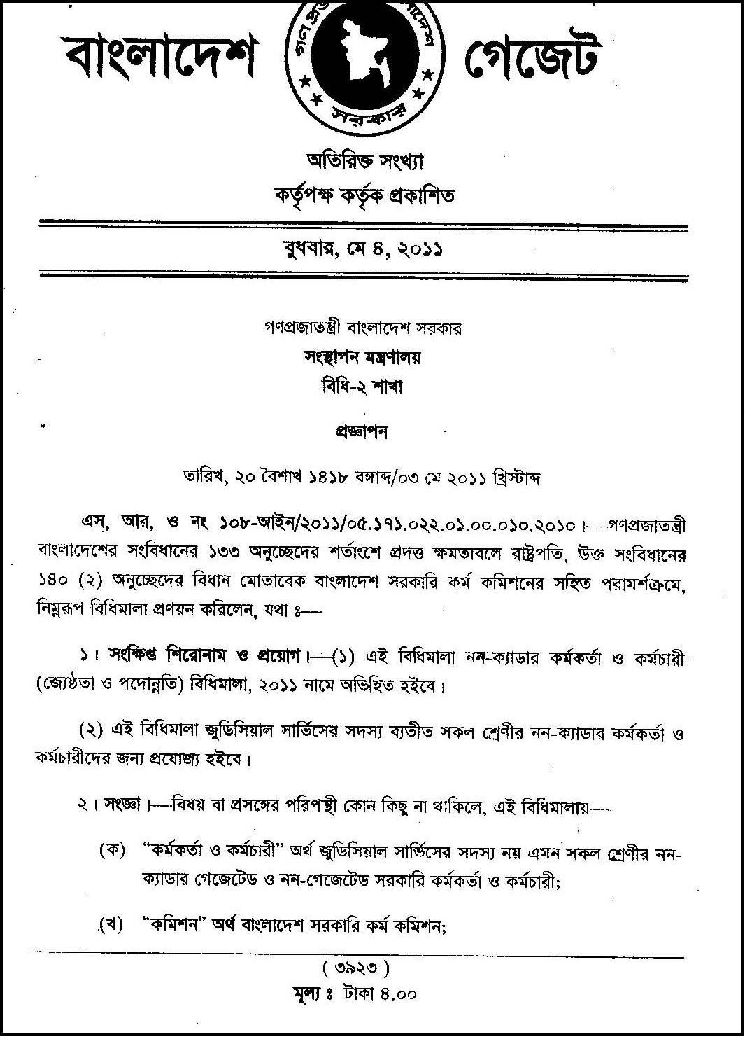 সরকারি চাকরিতে জ্যেষ্ঠতা নীতিমালা ২০১১ । নন-ক্যাডার কর্মকর্তা ও কর্মচারী (জ্যেষ্ঠতা ও পদোন্নতি) বিধিমালা দেখুন