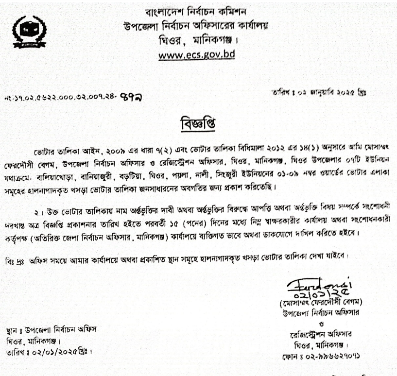 ভোটার তালিকা দেখা যাবে? ভোটার তালিকা আইন, ২০০৯ এর ধারা ৭(২) এবং ভোটার তালিকা বিধিমালা ২০১২ এর ১৪(১) অনুসারে আমি মোসাম্মৎ ফেরদৌসী বেগম, উপজেলা নির্বাচন অফিসার ও রেজিস্ট্রেশন অফিসার, ঘিওর, মানিকগঞ্জ, ঘিওর উপজেলার ০৭টি ইউনিয়ন যথাক্রমে- বালিয়াখোড়া, বানিয়াজুরী, বড়টিয়া, ঘিওর, পয়লা, নালী, সিংজুরী ইউনিয়নের ০১-০৯ নম্বর ওয়ার্ডের ভোটার এলাকা সমূহের হালনাগাদকৃত খসড়া ভোটার তালিকা প্রকাশ করা হয়েছে।