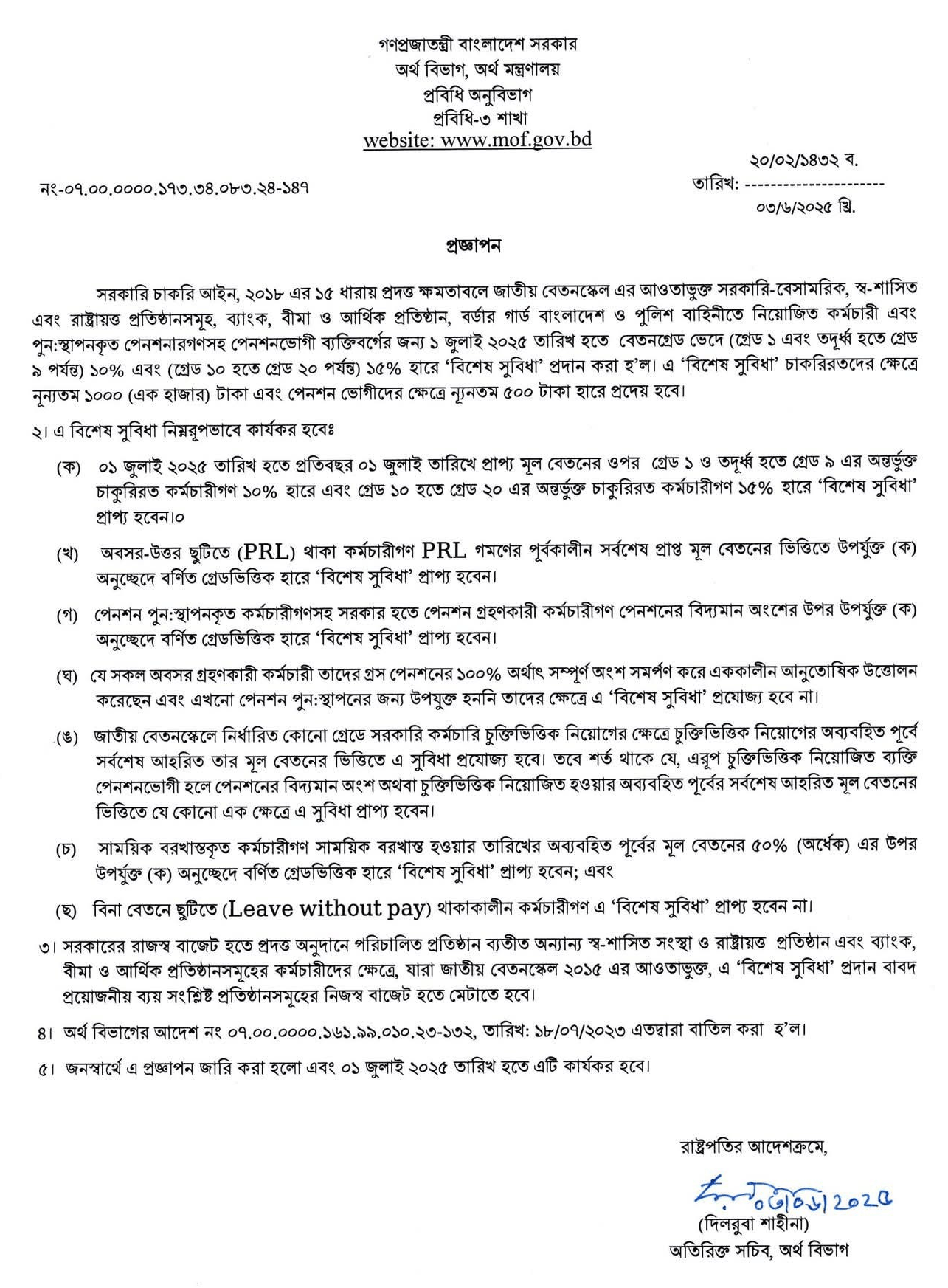 - ১১-২০ গ্রেডে জন্য ১৫% হারে বিশেষ সুবিধা আসে ২,৬২৮ টাকা।