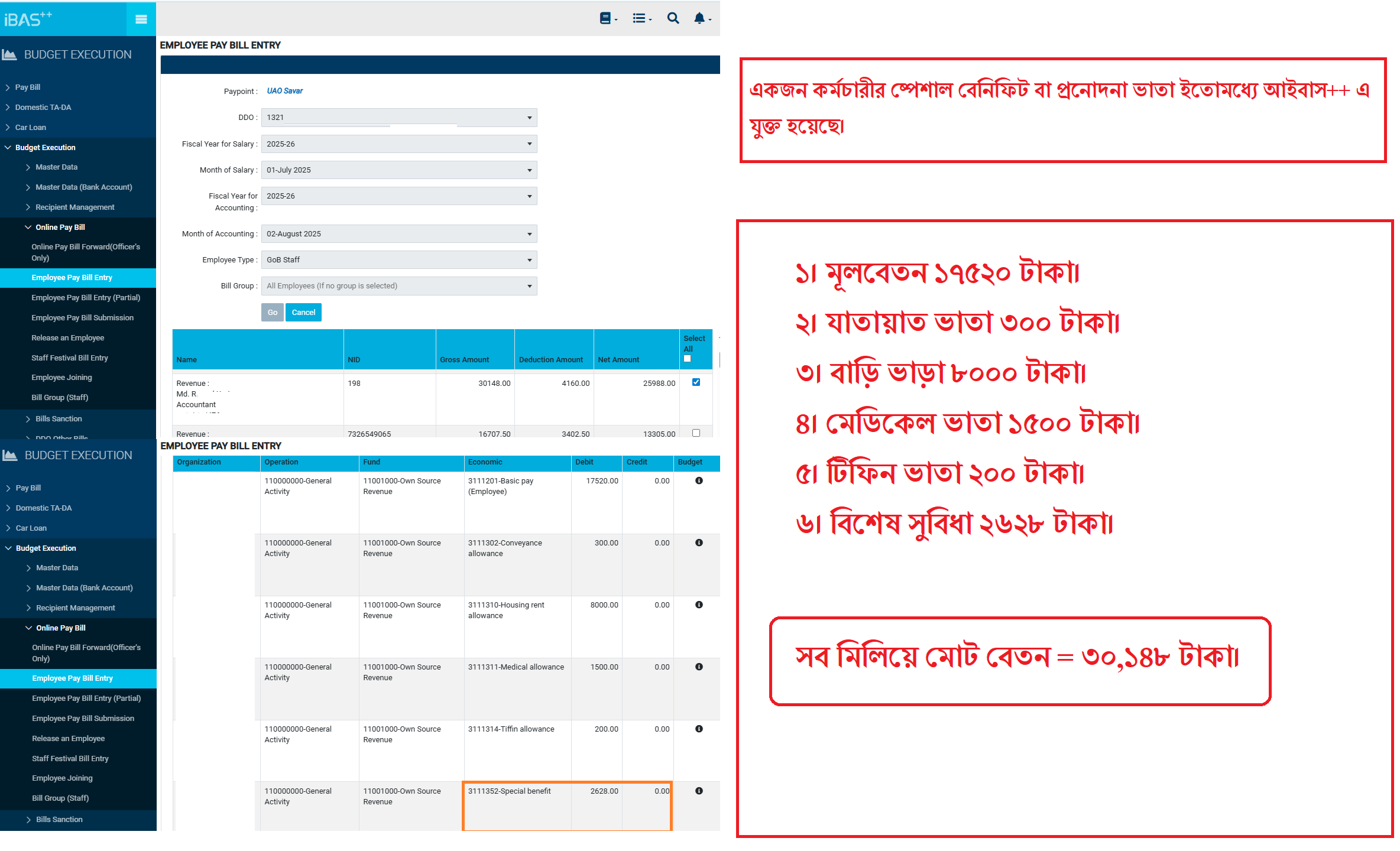 কর্মকর্তাদের নিজ নিজ বেতন বিল অনলাইনে দাখিল করার সময় বিশেষ সুবিধা দেখা যাচ্ছে এবং কত শতাংশ যুক্ত হয়েছে তা দেখা যাচ্ছে। এটি অটো যোগ হয়েছে কর্মচারী বা অফিস কর্তৃপক্ষের কিছুই করতে হবে না।