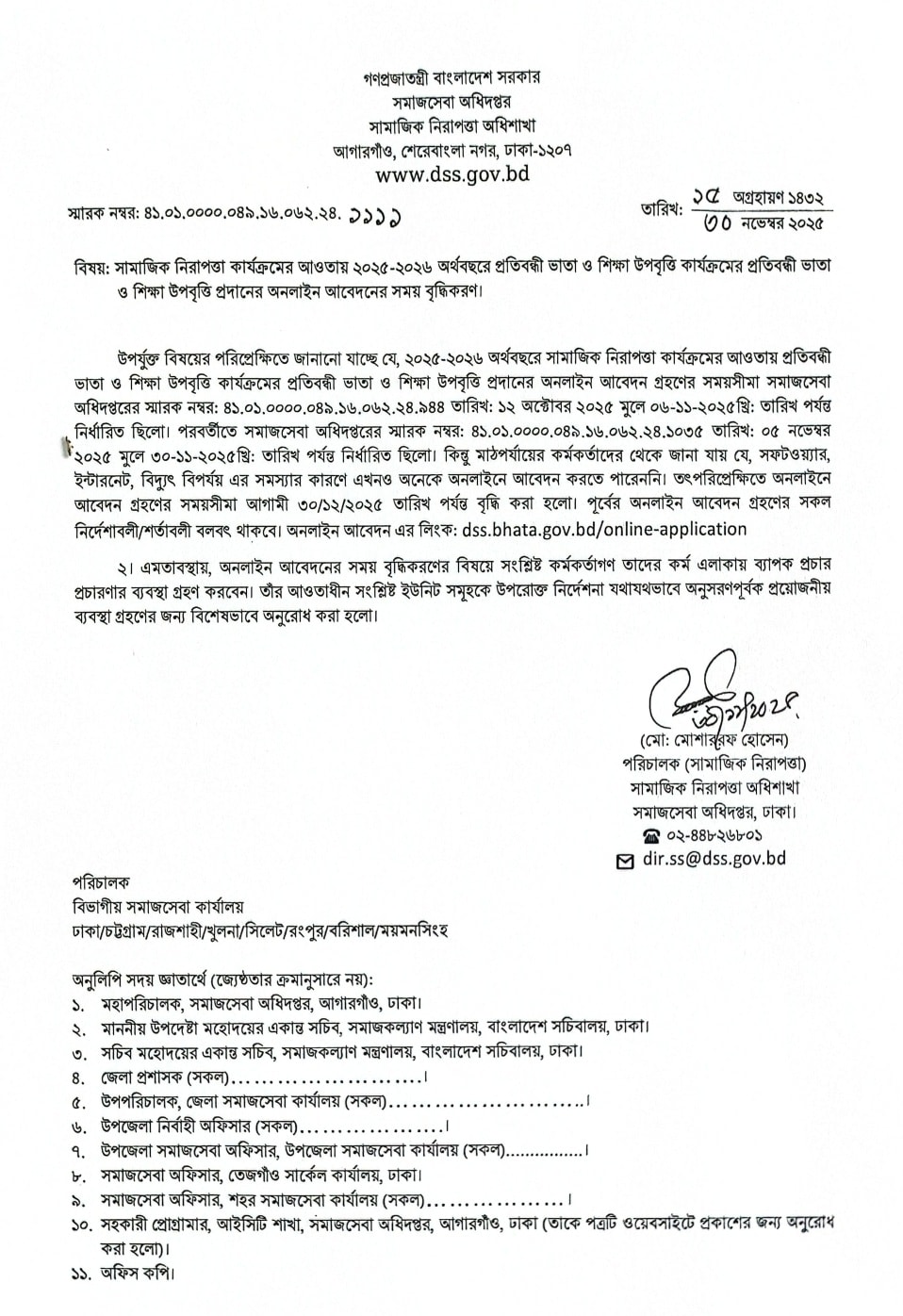 সমাজসেবা অধিদপ্তর (Department of Social Services – DSS) সূত্রে এই সময় বৃদ্ধির তথ্য নিশ্চিত করা হয়েছে। এর ফলে যেসব যোগ্য প্রার্থী এখনও আবেদন করতে পারেননি, তারা আরও এক মাস অতিরিক্ত সময় পেলেন।