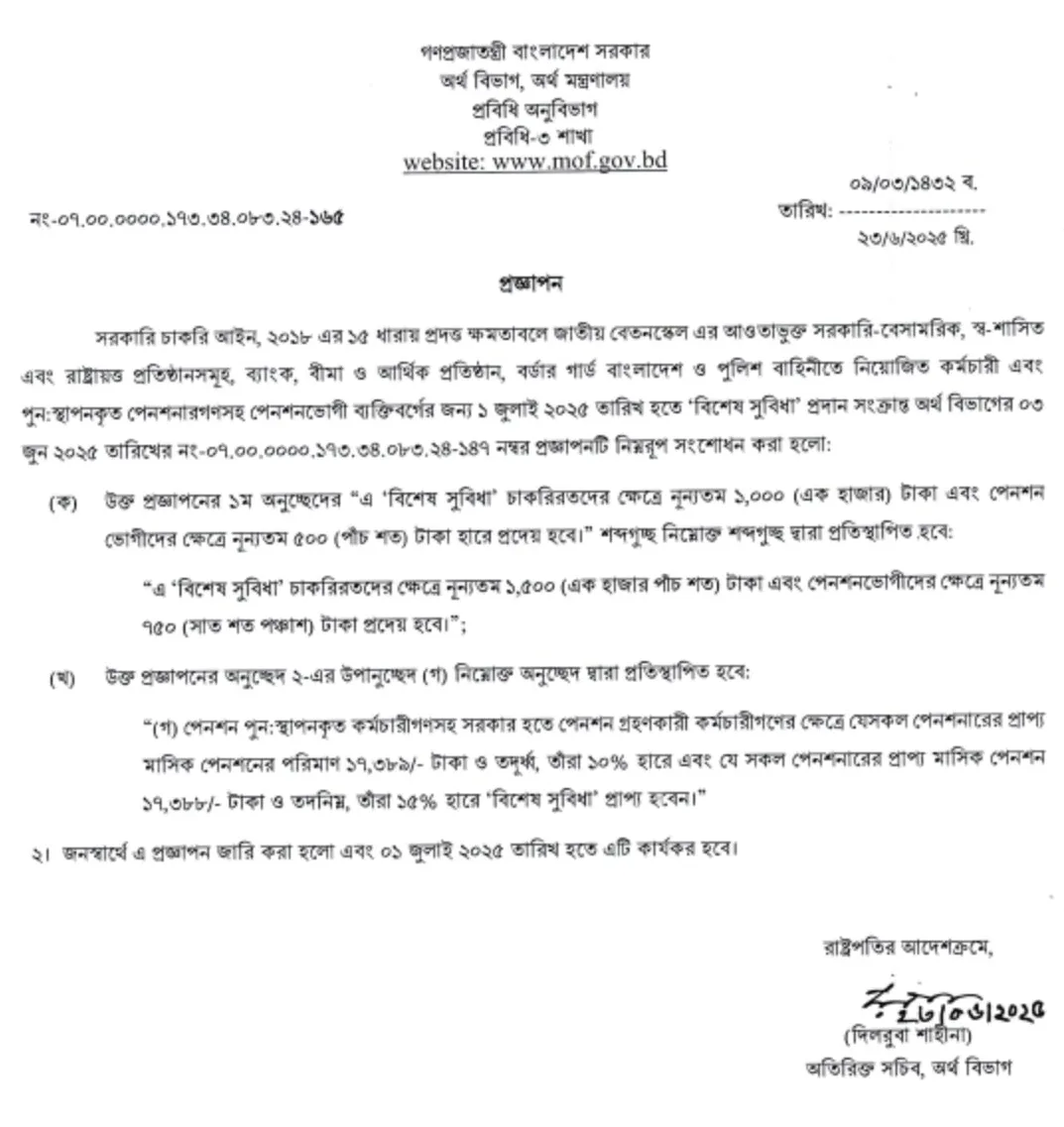সরকারি চাকরি আইন, ২০১৮ এর ১৫ ধারায় প্রদত্ত ক্ষমতাবলে জাতীয় বেতনস্কেল এর আওতাভুক্ত সরকারি-বেসামরিক, স্ব-শাসিত এবং রাষ্ট্রায়ত্ত প্রতিষ্ঠানসমূহ, ব্যাংক, বীমা ও আর্থিক প্রতিষ্ঠান, বর্ডার গার্ড বাংলাদেশ ও পুলিশ বাহিনীতে নিয়োজিত কর্মচারী এবং পুন:স্থাপনকৃত পেনশনারগণসহ পেনশনভোগী ব্যক্তিবর্গের জন্য ১ জুলাই ২০২৫ তারিখ হতে বেতনগ্রেড ভেদে (গ্রেড ১ এবং তদূর্ধ্ব হতে গ্রেড ৯ পর্যন্ত) ১০% এবং (গ্রেড ১০ হতে গ্রেড ২০ পর্যন্ত) ১৫% হারে ‘বিশেষ সুবিধা’ প্রদান করা হ’ল। এ ‘বিশেষ সুবিধা’ চাকরিরতদের ক্ষেত্রে নূন্যতম ১৫০০ (এক হাজার) টাকা এবং পেনশন ভোগীদের ক্ষেত্রে ন্যূনতম ৭৫০ টাকা হারে প্রদেয় হবে-বিশেষ সুবিধা প্রজ্ঞাপন ২০২৫