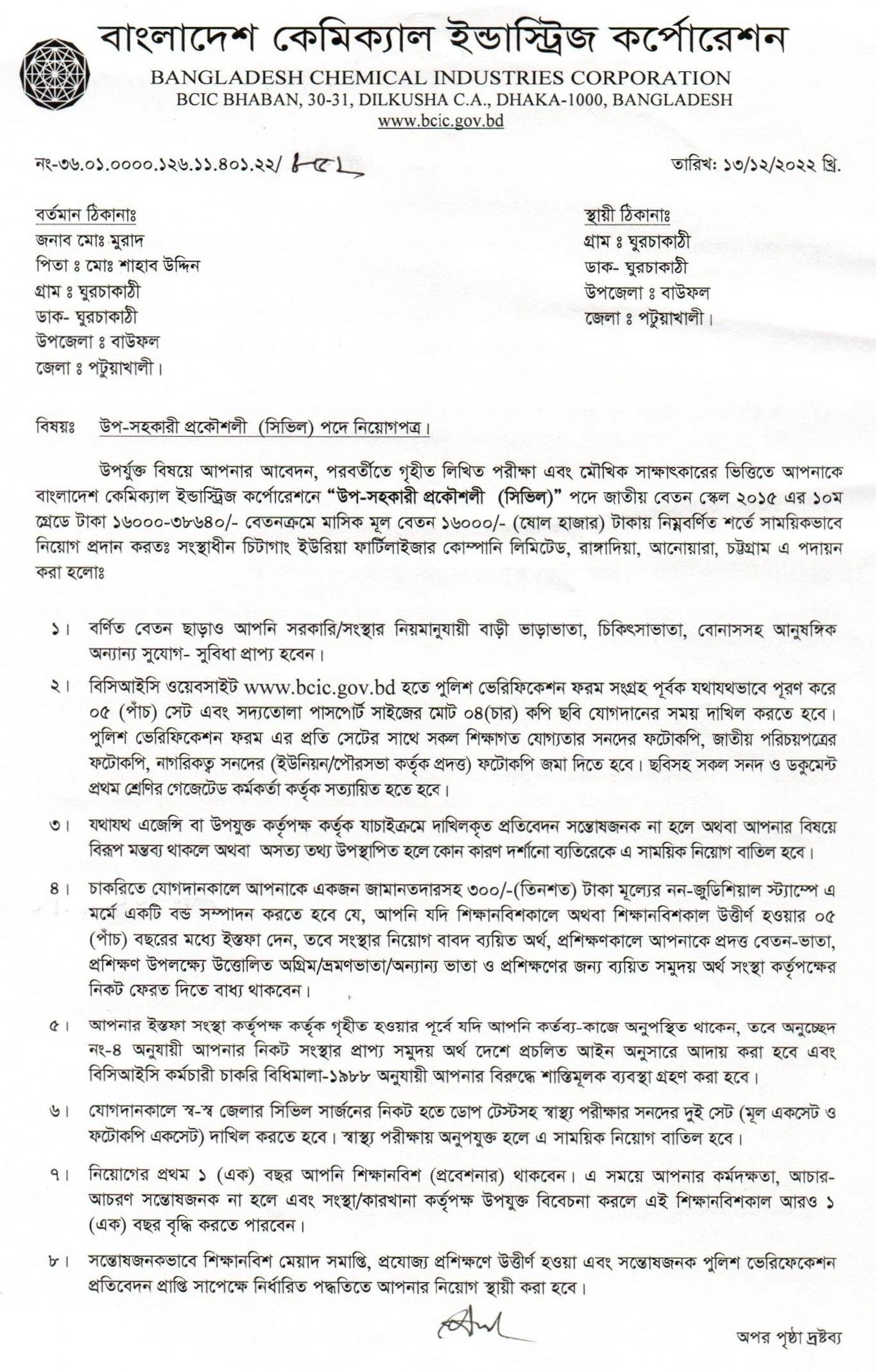 কর্পোরেশনের চাকরি কি যখন খুশি ছাড়া যায়? হ্যাঁ। আপনার আবেদনপত্রের সাথে সংযুক্ত কাগজপত্রে প্রদত্ত কোন তথ্য যদি ভবিষ্যতে অসত্য/ভুল প্রমাণিত হয় সে ক্ষেত্রে আপনার নিয়োগ সরাসরি বাতিল বলে গণ্য হবে। একই সাথে বিসিআইসি হতে গৃহীত সকল আর্থিক সুবিধাদি ফেরত প্রদান করতে হবে। বিসিআইসি কর্মচারী চাকরি প্রবিধানমালা-১৯৮৮ দ্বারা আপনার চাকরি নিয়ন্ত্রিত হবে। কর্তৃপক্ষ প্রয়োজনবোধে আপনার চাকরির শর্তাবলী বা দায়িত্বের প্রকৃতি পরিবর্তন করতে পারবে।প্রথম নিয়োগপ্রাপ্ত কর্মস্থলে আপনাকে কমপক্ষে ০৩ (তিন) বছর চাকরি করতে হবে। তবে কর্তৃপক্ষ সংস্থার অধীনস্থ যে কোন কারখানা/প্রতিষ্ঠান/প্রকল্পে আপনাকে বদলী করতে পারবে। বিসিআইসি কর্মচারী চাকরি প্রবিধানমালা-১৯৮৮ ও সরকারি ছুটি সংক্রান্ত বিধি অনুযায়ী আপনি ছুটি প্রাপ্য হবেন। বিসিআইসি কর্মচারী সাধারণ ভবিষ্য তহবিল এর নিয়মানুযায়ী আপনি উক্ত তহবিলের সদস্য হতে পারবেন এবং সুবিধাদি ভোগ করতে পারবেন। সংস্থার অথবা এর অধীনস্থ কারখানা/প্রকল্পের ব্যবসা বাণিজ্য/সম্পত্তি/গোপনীয় বিষয়/অন্যান্য বিষয়/গোপনীয় তথ্য, ইত্যাদি ব্যাপারে আপনি প্রত্যক্ষ এবং পরোক্ষভাবে অন্যের কাছে/অন্যান্য সংস্থা/প্রতিষ্ঠানের কাছে আলাপ/ফাঁস করতে পারবেন না। চাকরিতে যোগদানের সময় আপনাকে নিজের জন্য বা পরিবারের অন্য সদস্যের জন্য “যৌতুক দিবেন না এবং যৌতুক নিবেন না” মর্মে অঙ্গীকার নামা প্রদান করতে হবে। চাকরিতে যোগদান কালে আসা যাওয়ার জন্য আপনি কোন টিএ/ডিএ প্রাপ্য হবেন না। যোগদানকালে স্ব-স্ব জেলার সিভিল সার্জনের নিকট হতে ডোপ টেস্টসহ স্বাস্থ্য পরীক্ষার সনদের দুই সেট জমা দিতে হবে।