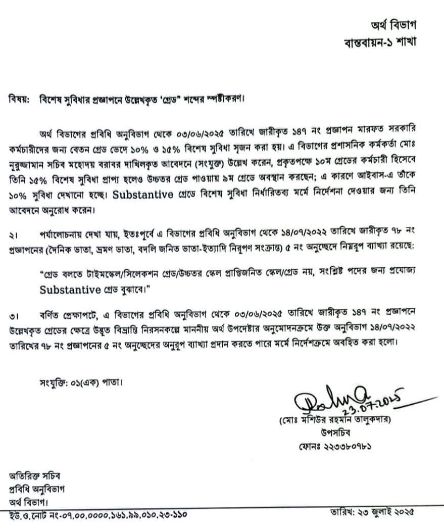 বিশেষ সুবিধার প্রজ্ঞাপনে ‘গ্রেড” স্পষ্টীকরণ ২০২৫ । গ্রেড বলতে Substantive Grade কে বুঝানো হয়েছে?