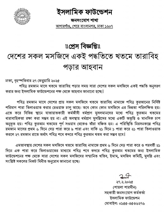 পবিত্র রমজান মাসে খতমে তারাবিহ পড়ার সময় সারা দেশের সকল মসজিদে একই পদ্ধতি অনুসরণ করার জন্য ইসলামিক ফাউন্ডেশনের পক্ষ থেকে আহবান জানানো হয়েছে-ইসলামিক ফাউন্ডেশন –তারাবির নামাজের নিয়ম ২০২৫