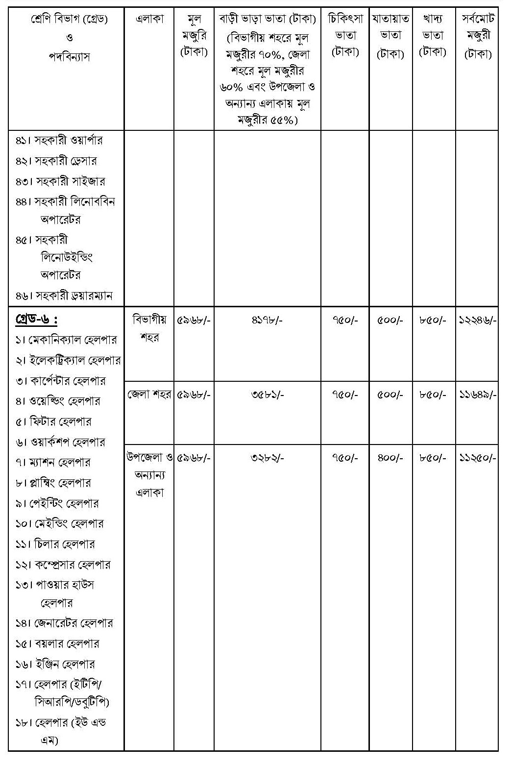 তফসিল-ক ও তফসিল-খ এ উল্লিখিত নিম্নতম মজুরী ও বিভিন্ন ভাতা ছাড়াও শ্রমিক ও কর্মচারী কর্মরত প্রতিষ্ঠানে অন্যান্য যে সকল অধিকার, সুযোগ-সুবিধা ও ভাতা প্রাপ্য হন উহা বাংলাদেশ শ্রম আইন, ২০০৬ এর সংশ্লিষ্ট ধারার বিধান মোতাবেক বলবৎ ও অব্যাহত থাকিবে। এই প্রজ্ঞাপনে উল্লিখিত নিম্নতম মজুরী সমন্বয় করিয়া ১ (এক) বৎসর কর্মরত থাকিবার পর শ্রমিক ও কর্মচারীর মূল মজুরীর ৫% (শতকরা পাঁচ শতাংশ) হারে বাৎসরিক ভিত্তিতে মজুরী বৃদ্ধি পাইবে এবং পরবর্তী বৎসরে ক্রমবর্ধমান হারে পুনরায় মূল মজুরীর ৫% (শতকরা পাঁচ শতাংশ) হারে বৃদ্ধি পাইবে। ব্যাখ্যা: যদি একজন শ্রমিকের মূল মজুরী ৫,১৬২/- (পাঁচ হাজার একশত বাষট্টি) টাকা হয়, তবে এক বৎসর কর্মরত থাকিবার পর তাহার বাৎসরিক মজুরী বৃদ্ধি পাইয়া মূল মজুরী ৫,৪২০.১০ (পাঁচ হাজার চারশত বিশ টাকা দশ পয়সা) টাকা নির্ধারিত হইবে এবং পরবর্তী বৎসরে ক্রমবর্ধমান হারে পুনরায় ৫% হারে বৃদ্ধি পাইবে অর্থাৎ মূল মজুরী ৫,৪২০.১০ (পাঁচ হাজার চারশত বিশ টাকা দশ পয়সা) টাকার ৫% বৃদ্ধি পাইয়া ৫,৬৯১.১১ (পাঁচ হাজার ছয়শত একানব্বই টাকা এগারো পয়সা) টাকা নির্ধারিত হইবে।