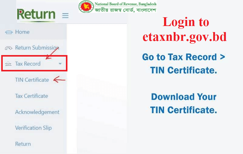 - সবশেষে E Return সিস্টেমে Sign In করুন। Tax Record অপশন থেকে TIN Certificate লিংকে ক্লিক করুন।