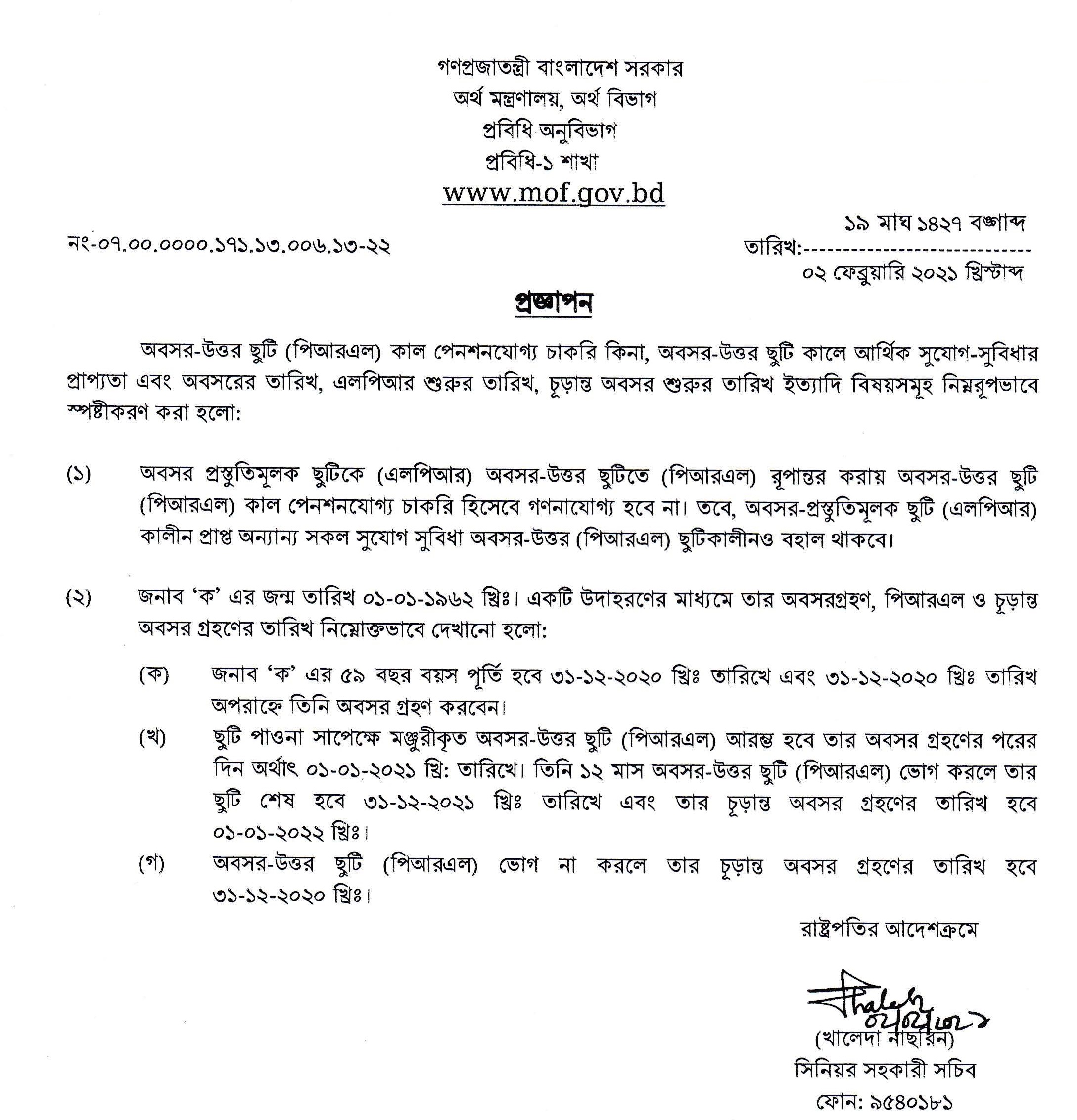 অবসর উত্তর ছুটি ২০২৫ । PRL এর ১৩ মাস পূর্বে কোন কর্মচারীকে অন্যত্র বদলী নয়?