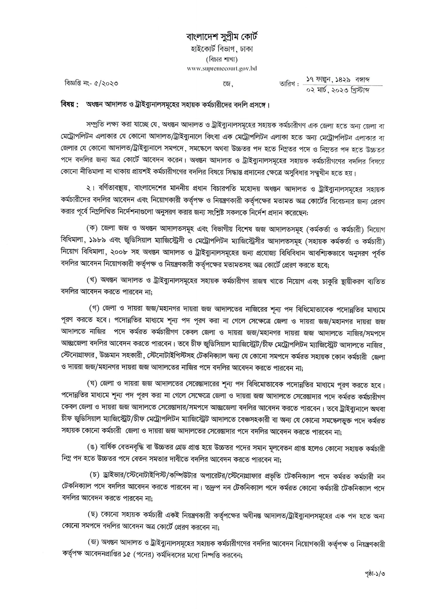 - অধস্তন আদালত ও ট্রাইব্যুনালসমূহের সহায়ক কর্মচারীগণ রাজস্ব খাতে নিয়োগ এবং চাকুরি স্থায়ীকরণ ব্যতিত বদলির আবেদন করতে পারবেন না;