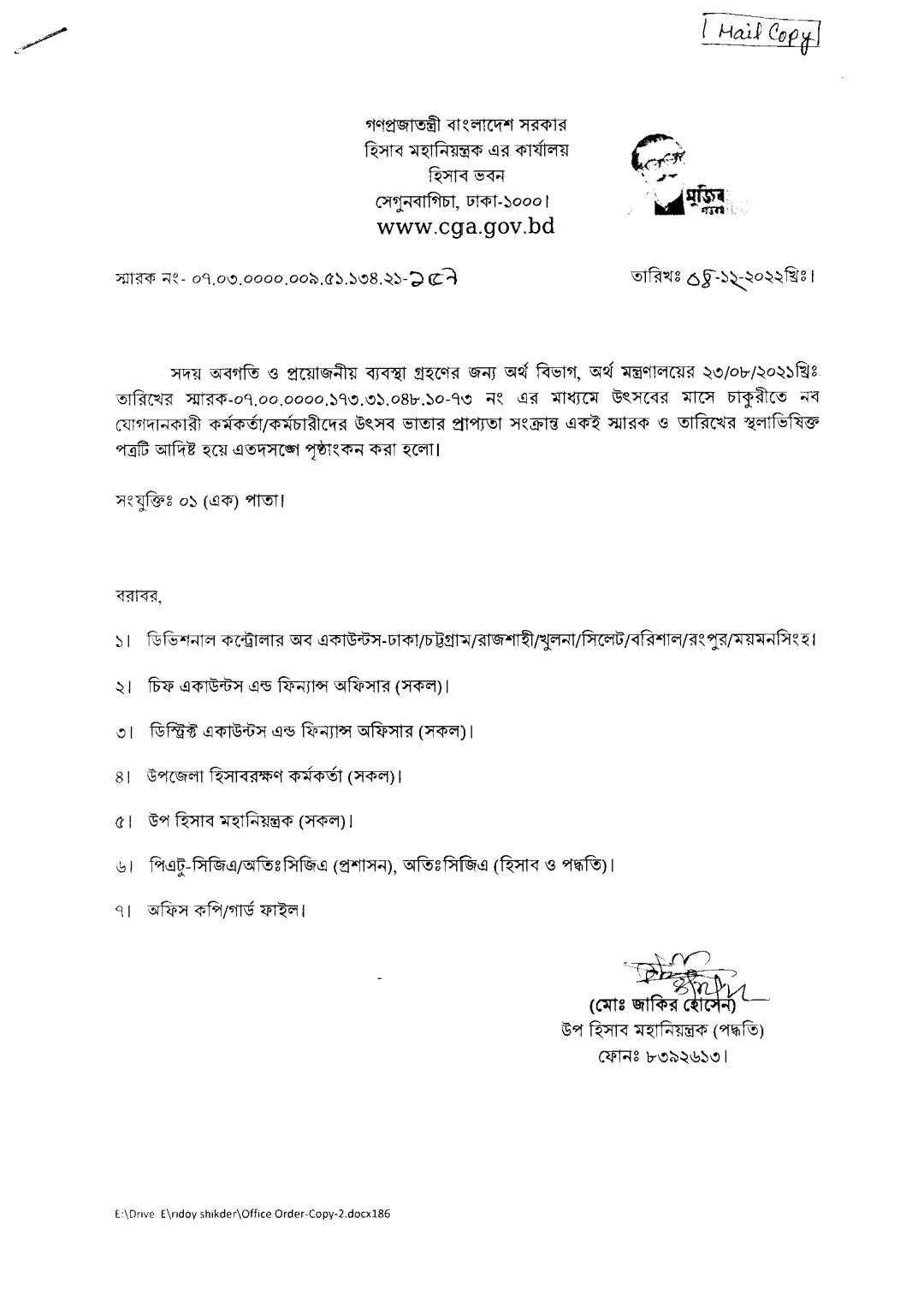 পরবর্তীতে ৪ ডিসেম্বর ২০২২ তারিখে হিসাব মহানিয়ন্ত্রক (CGA) কার্যালয় থেকেও এই নির্দেশনাটি পুনরায় সকল বিভাগীয়, জেলা ও উপজেলা হিসাবরক্ষণ অফিসে কার্যকরের জন্য পাঠানো হয় ।