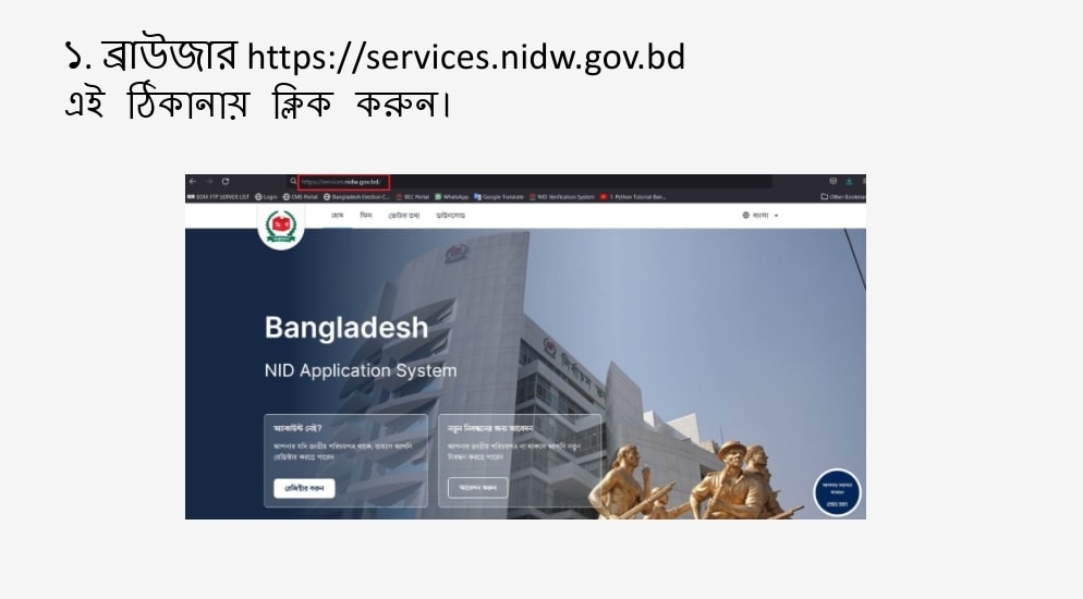- ব্রাউজার https://services.nidw.gov.bd এই ঠিকানায় ক্লিক করুন।