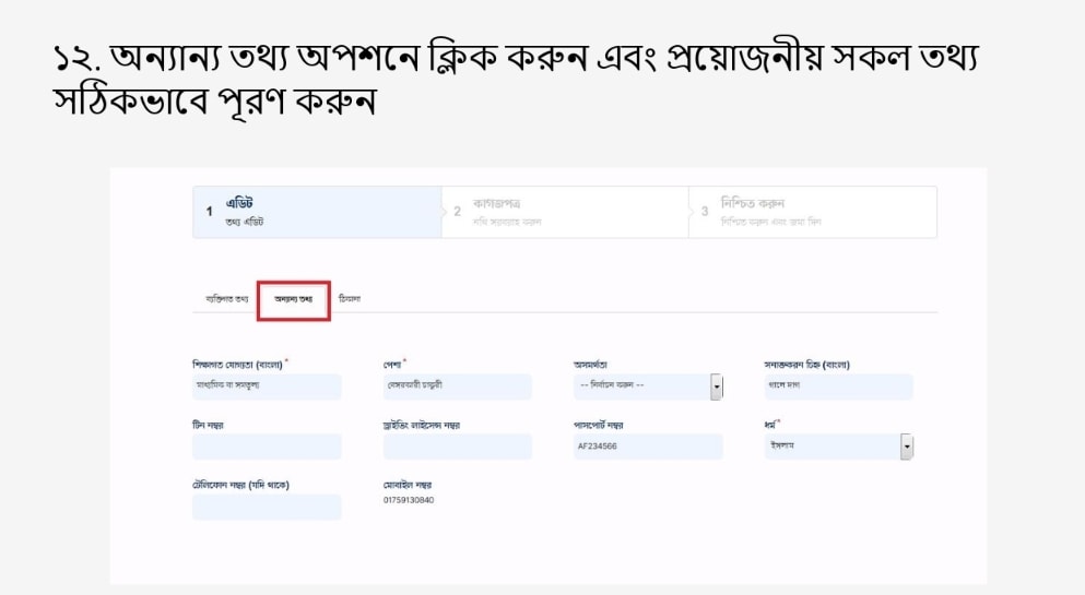 - অন্যান্য তথ্য অপশনে ক্লিক করুন এবং প্রয়োজনীয় সকল তথ্য সঠিকভাবে পূরণ করুন।