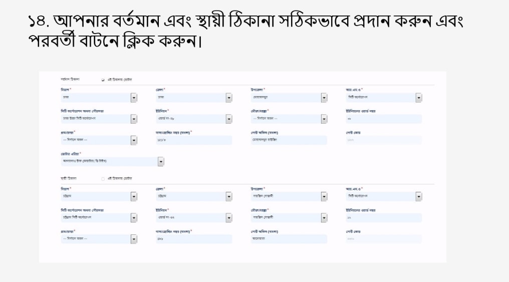 - আপনার বর্তমান এবং স্থায়ী ঠিকানা সঠিকভাবে প্রদান করুন এবং পরবর্তী বাটনে ক্লিক করুন।