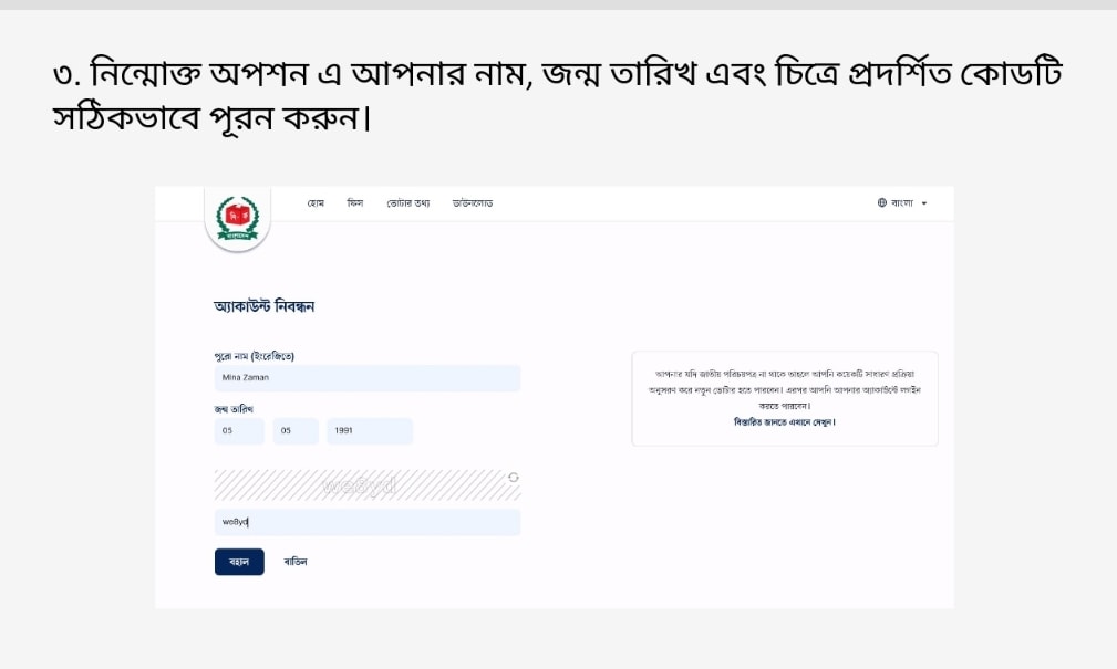 - ফর্মে নাম, জন্ম তারিখ এবং ক্যাপচা কোডটি টাইপ করুন।