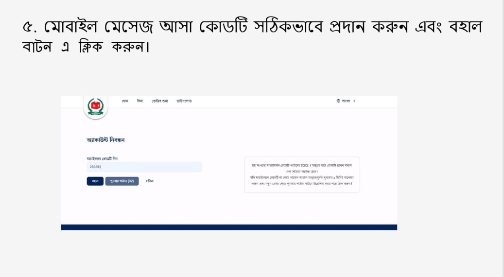 - মোবাইল মেসেজ আসা কোডটি সঠিকভাবে প্রদান করু এবং বহাল এ ক্লিক করুন।