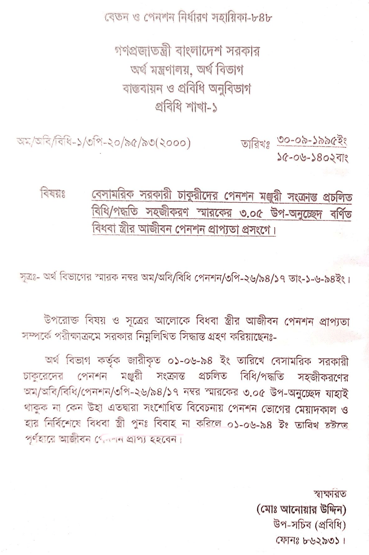 পারিবারিক পেনশন- ০১/০৬/১৯৯৪ খ্রি: হতে শুরু হয়। ফাইন্যান্স এন্ড রেভিনিউ ডিপার্টমেন্টের অডিট ব্রাঞ্চের মেমো নং- ২৫৬৬(৪০)-এফ, তারিখ: ১৬/০৪/১৯৫৯ খ্রিস্টাব্দ এবং অর্থ মন্ত্রণালয়ের অর্থ বিভাগের স্মারক নং- অম/অবি/বিধি-১/৩পি-২/২০০৫(অংশ-১)/৫, তারিখ: ২৭/০১/২০০৯ খ্রিস্টাব্দ অনুসারে পূর্ণ হারে আজীবন পারিবারিক পেনশন পাবেন।